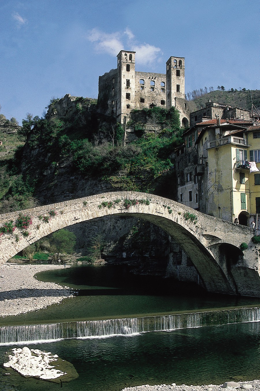 Ripresa l'auto raggiungiamo il borgo, che ci offre la vista dell'intatto nucleo medievale dominato dal castello ed arricchito in basso dall'elegante arco del ponte. Svoltiamo a destra in corrispondenza della radice del ponte medievale immediatamente prima del monumento ai Caduti e passando a sinistra della chiesetta scendiamo al parcheggio. Da qui vediamo in alto il castello sulla roccia a strapiombo su di noi, a destra il ponte, di fronte il borgo medievale e a sinistra le vigne del ben noto vino Rossese.